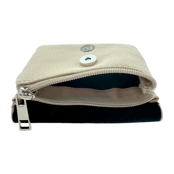 Perfekt organisiert und griffbereit! Für Karten, Bargeld und Kleinigkeiten. Die magnetische Kappe auf der Vorderseite mit silbernem Verschluss hält alles sicher zusammen, während das Reißverschlussfach deine kleineren Schätze verstaut.