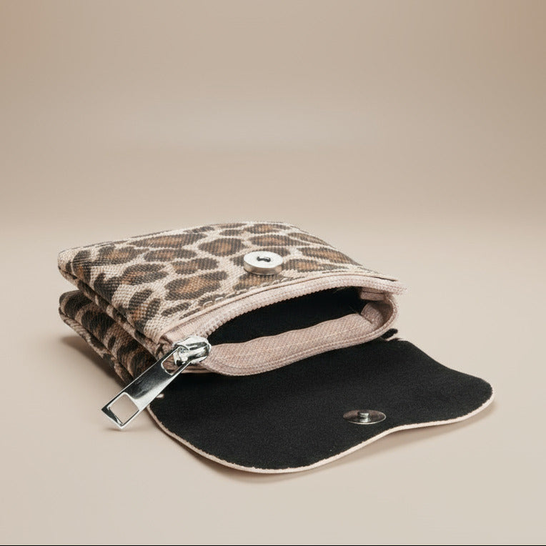 Perfekt organisiert und griffbereit! Für Karten, Bargeld und Kleinigkeiten. Die magnetische Kappe auf der Vorderseite mit silbernem Verschluss hält alles sicher zusammen, während das Reißverschlussfach deine kleineren Schätze verstaut.