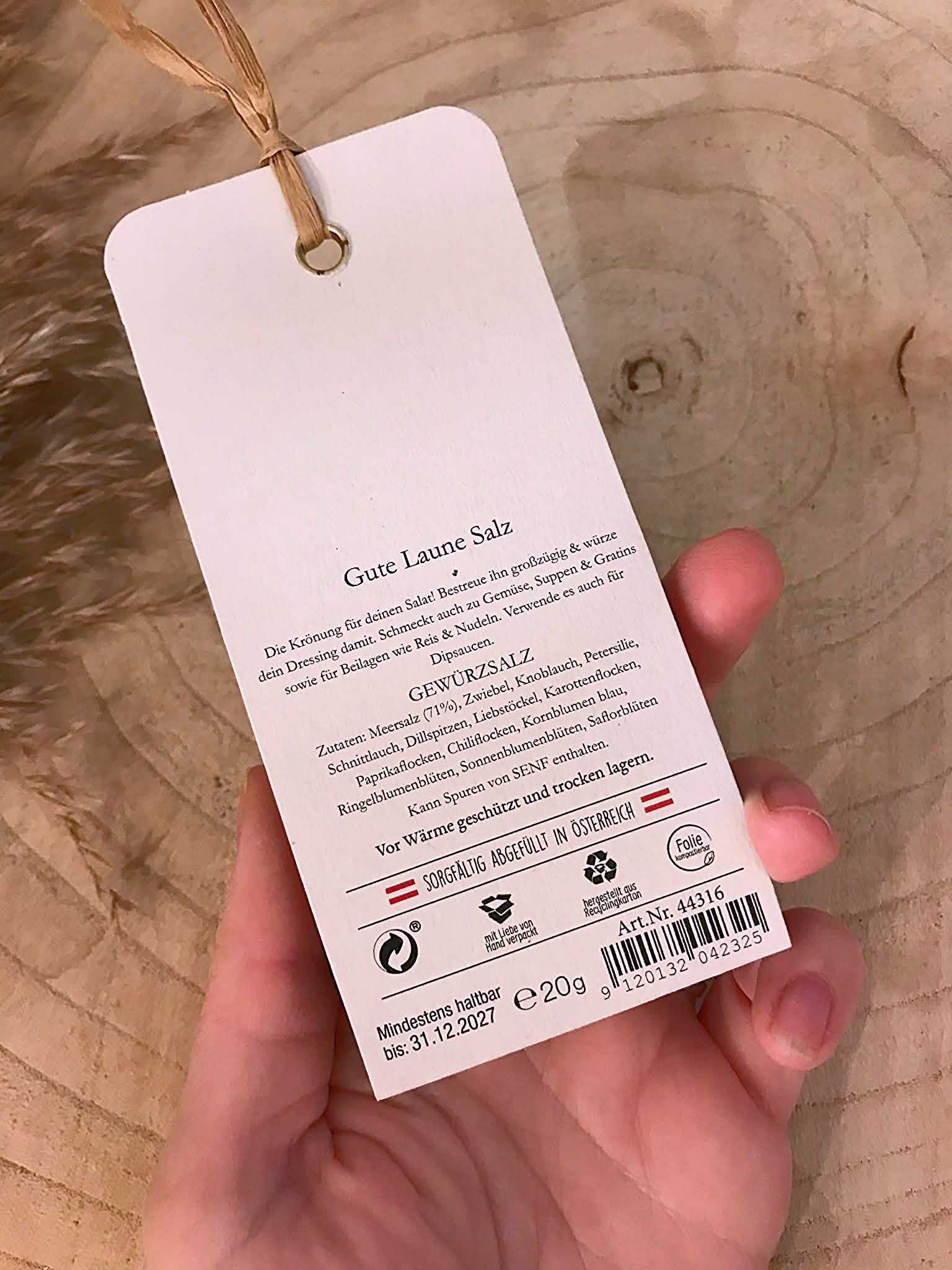Zutaten: Meersalz (71%), Zwiebel, Knoblauch, Petersilie, Schnittlauch, Dillspitzen, Liebstöckel, Karottenflocken, Paprikaflocken, Chiliflocken, Kornblumen blau, Ringelblumenblüten, Sonnenblumenblüten, Saflorblüten