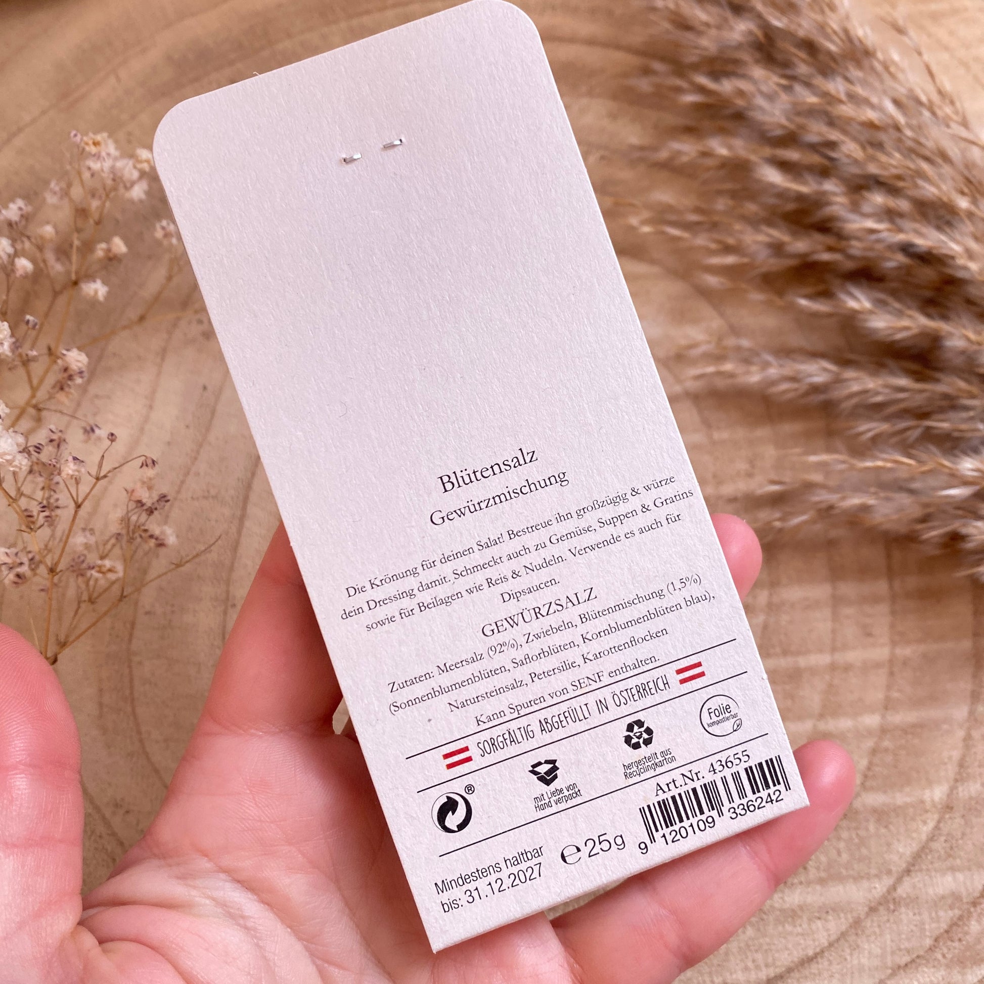 Zutaten: Meersalz (92%), Zwiebeln, Blütenmischung (1,5%) (Sonnenblumenblüten, Saflorblüten, Kornblumenblüten blau), Natursteinsalz, Petersilie, Karottenflocken