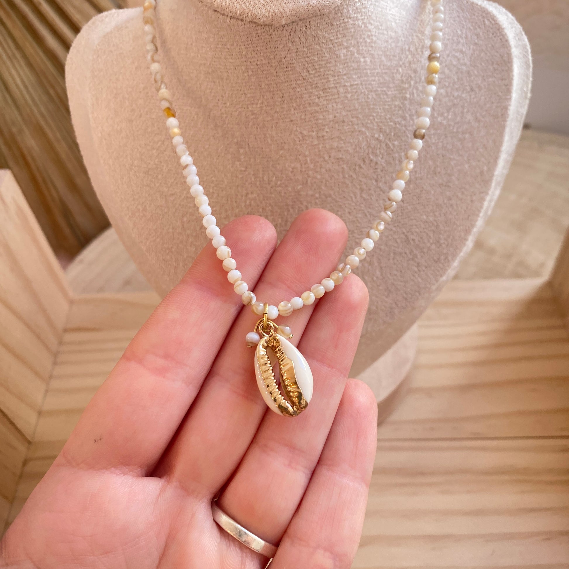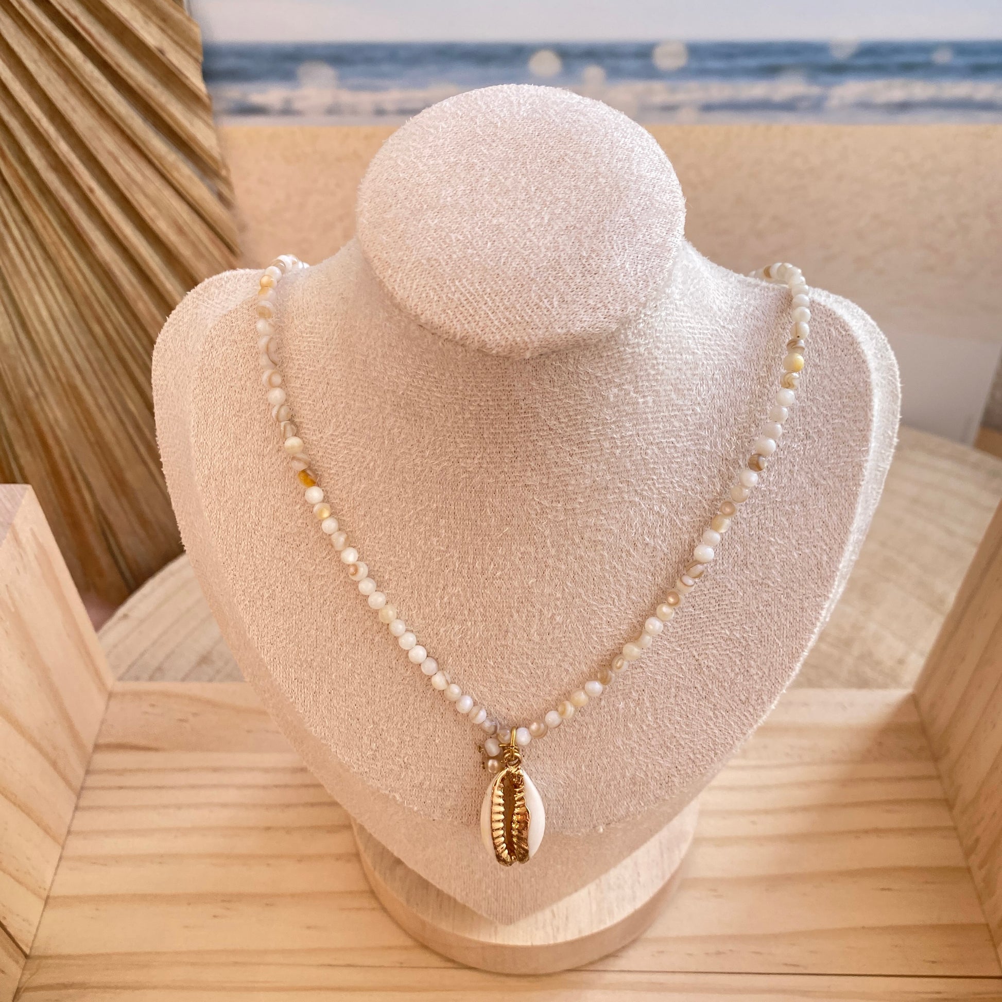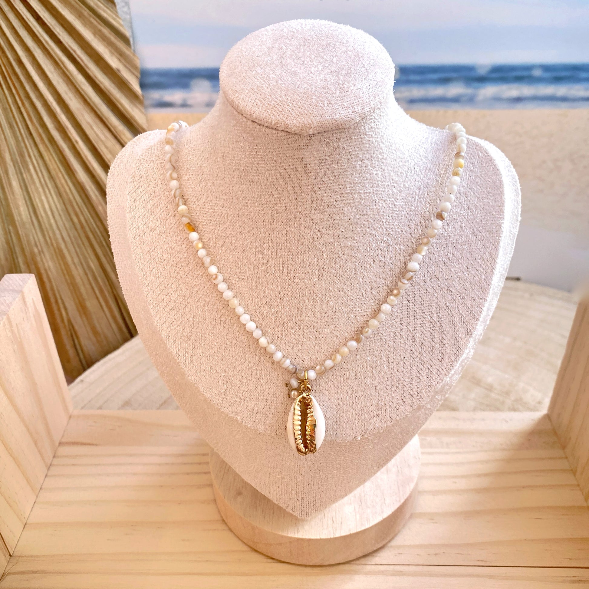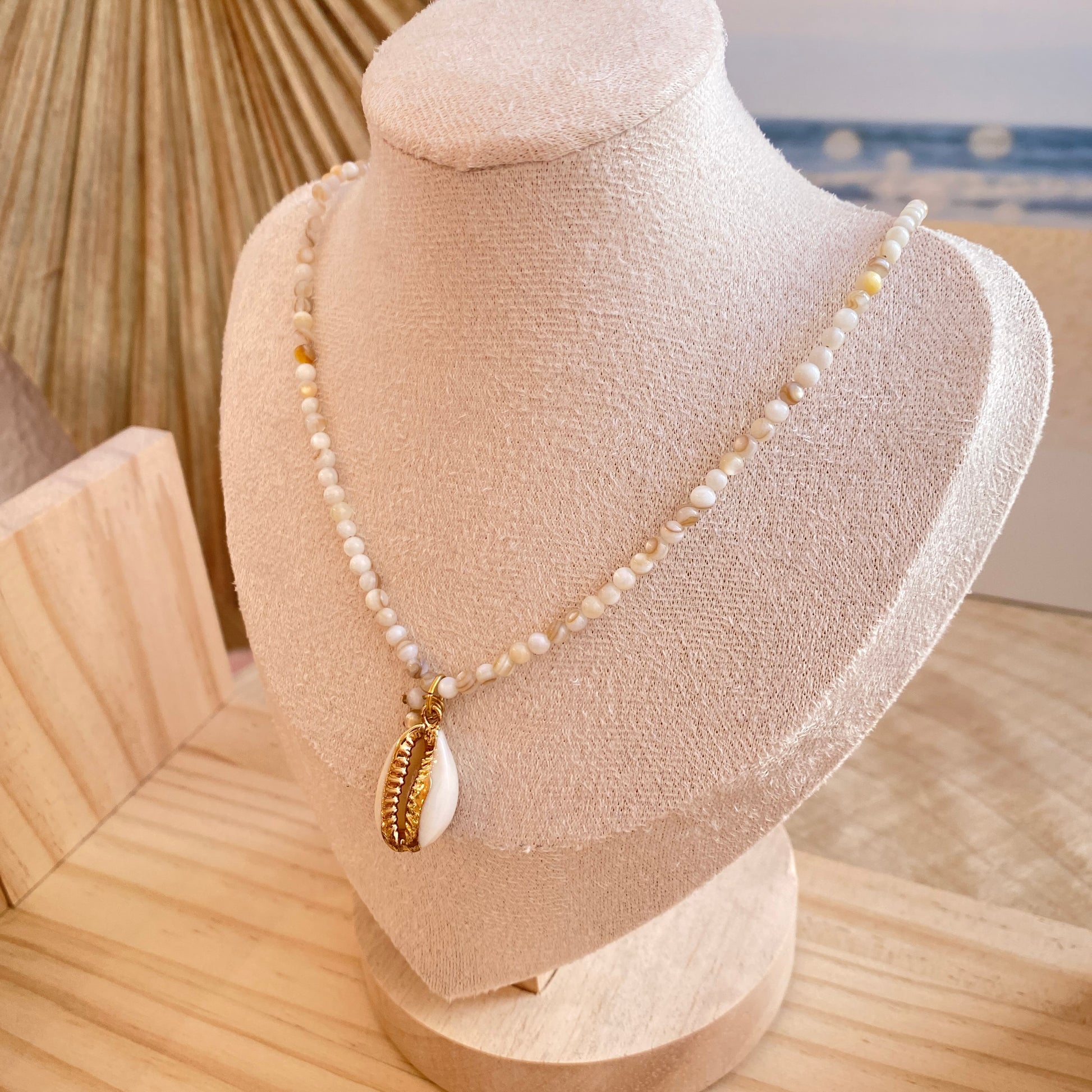 Hol dir den perfekten Look mit dieser sommerlichen Perlenkette und einer Kauri Muschel als Anhänger. Verstellbar mit einem Verlängerungskettchen von 8 cm aus Edelstahl.