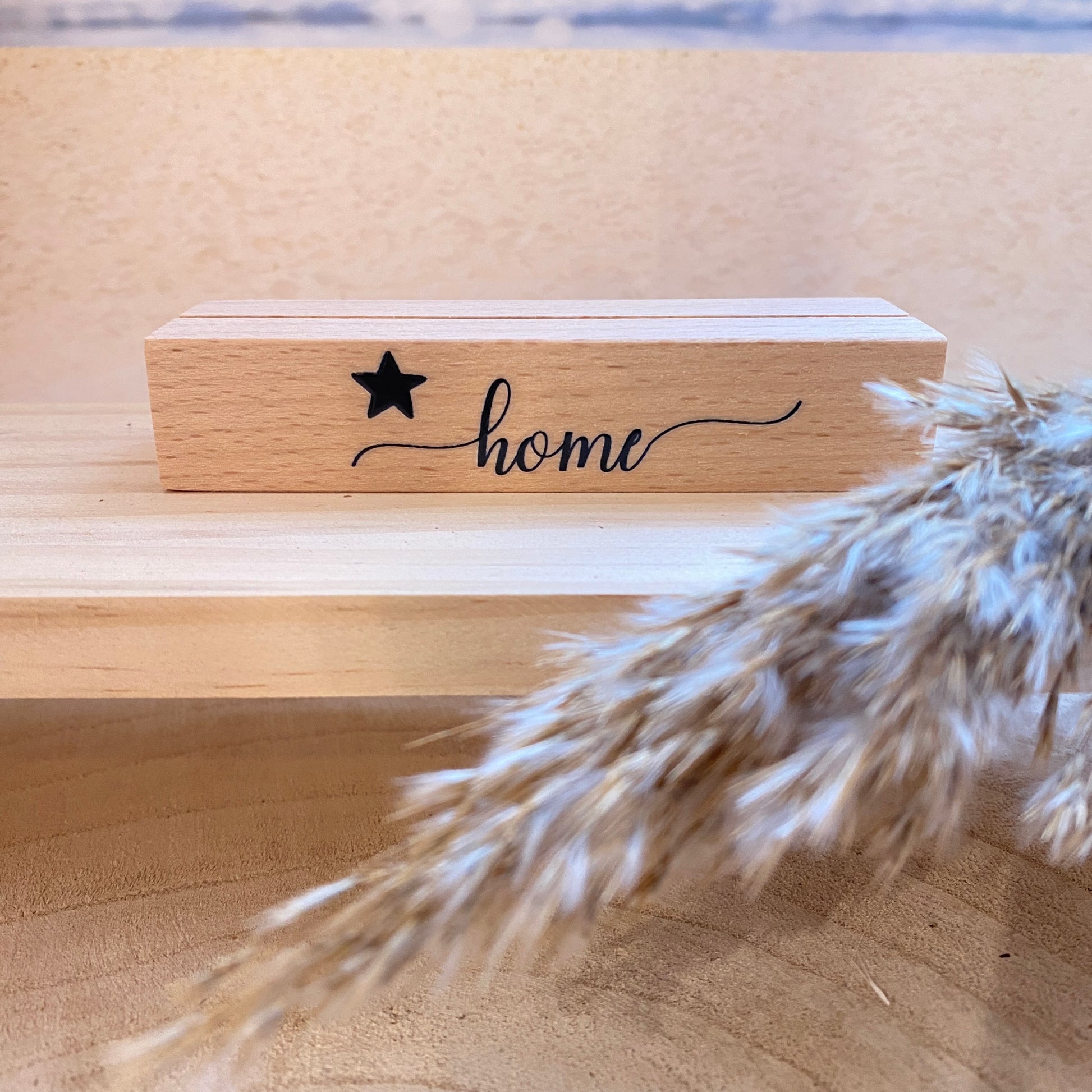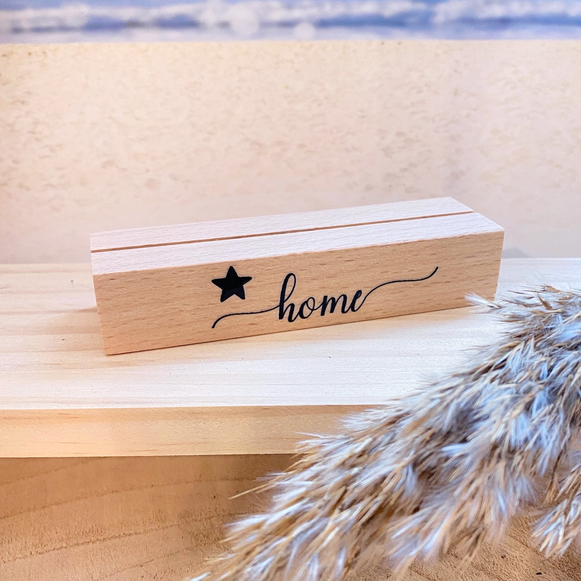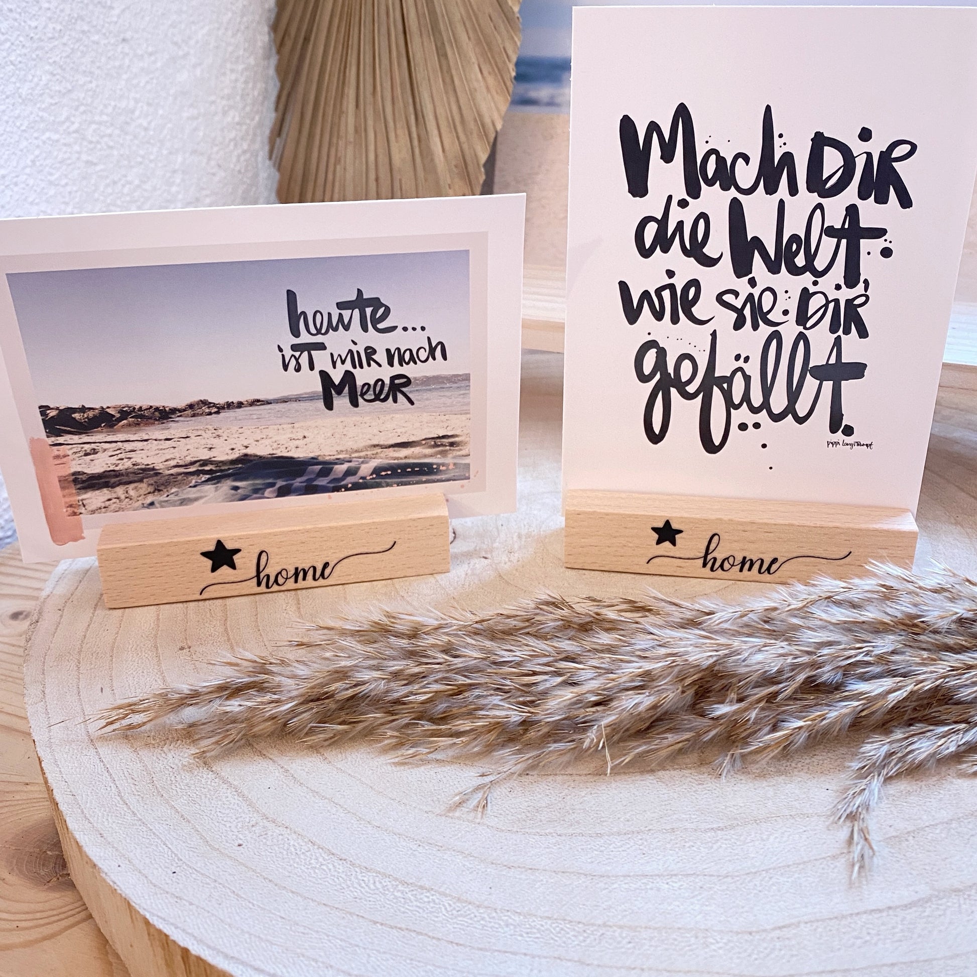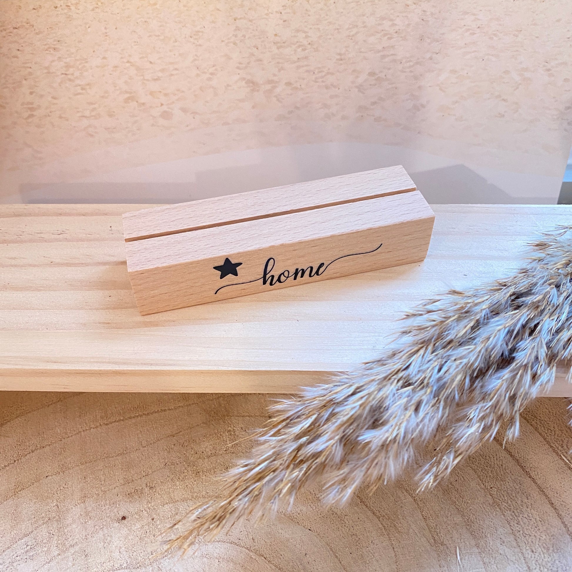 Kartenhalter aus Buchenholz mit schwarzen Prägedruck. Perfekt für das Halten von Erinnerungen wie Fotos, Lieblings-Postkarten, einem witzigen Duck oder als Tischaufsteller. Die Holzmaserung kann aufgrund des Naturmaterials abweichen.