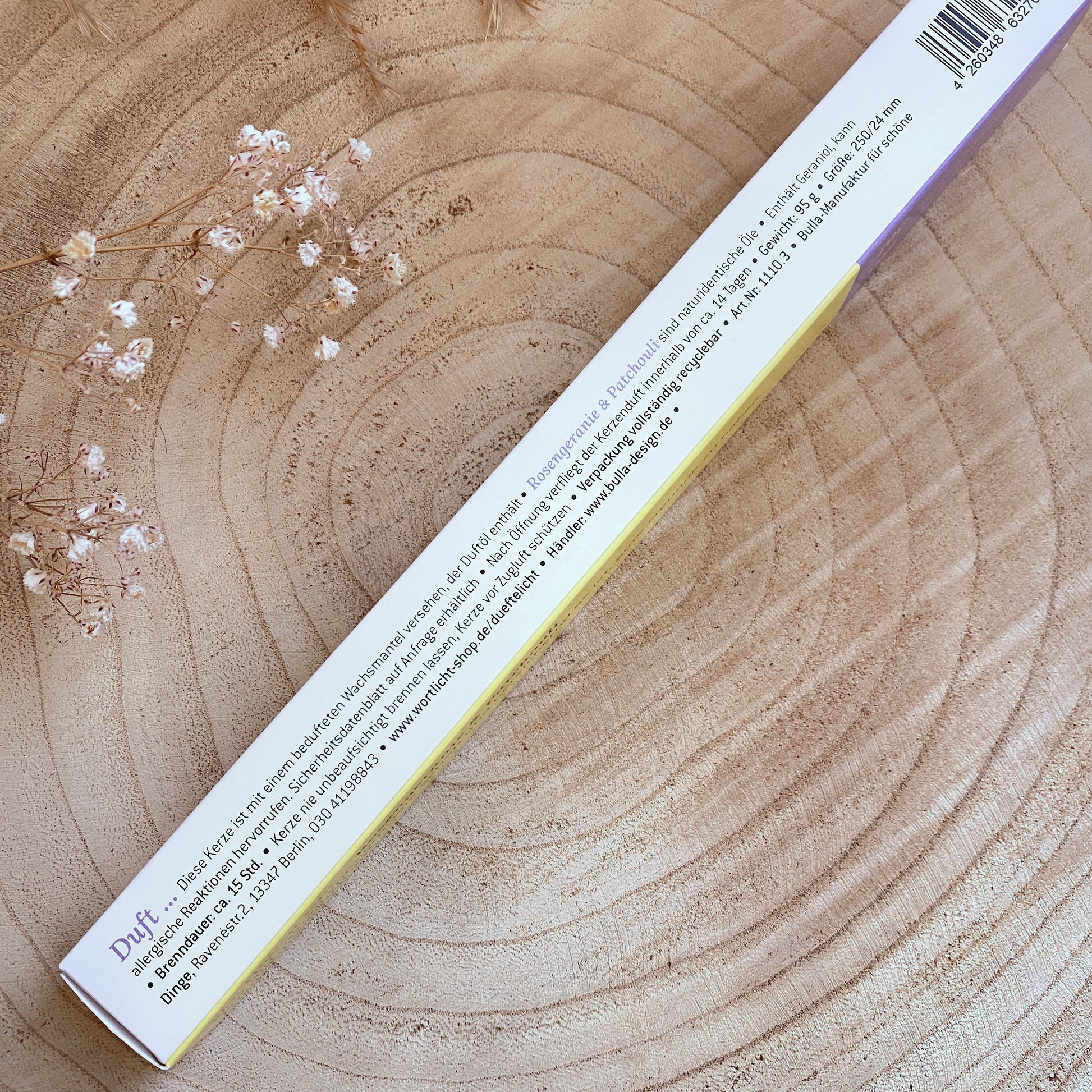 Duft: Rosengeranie & Patchouli . Diese Kerze ist mit einem bedufteten Wachsmantel versehen, der Duftöl enthält. Enthält Geraniol, kann allergische Reaktionen hervorrufen.