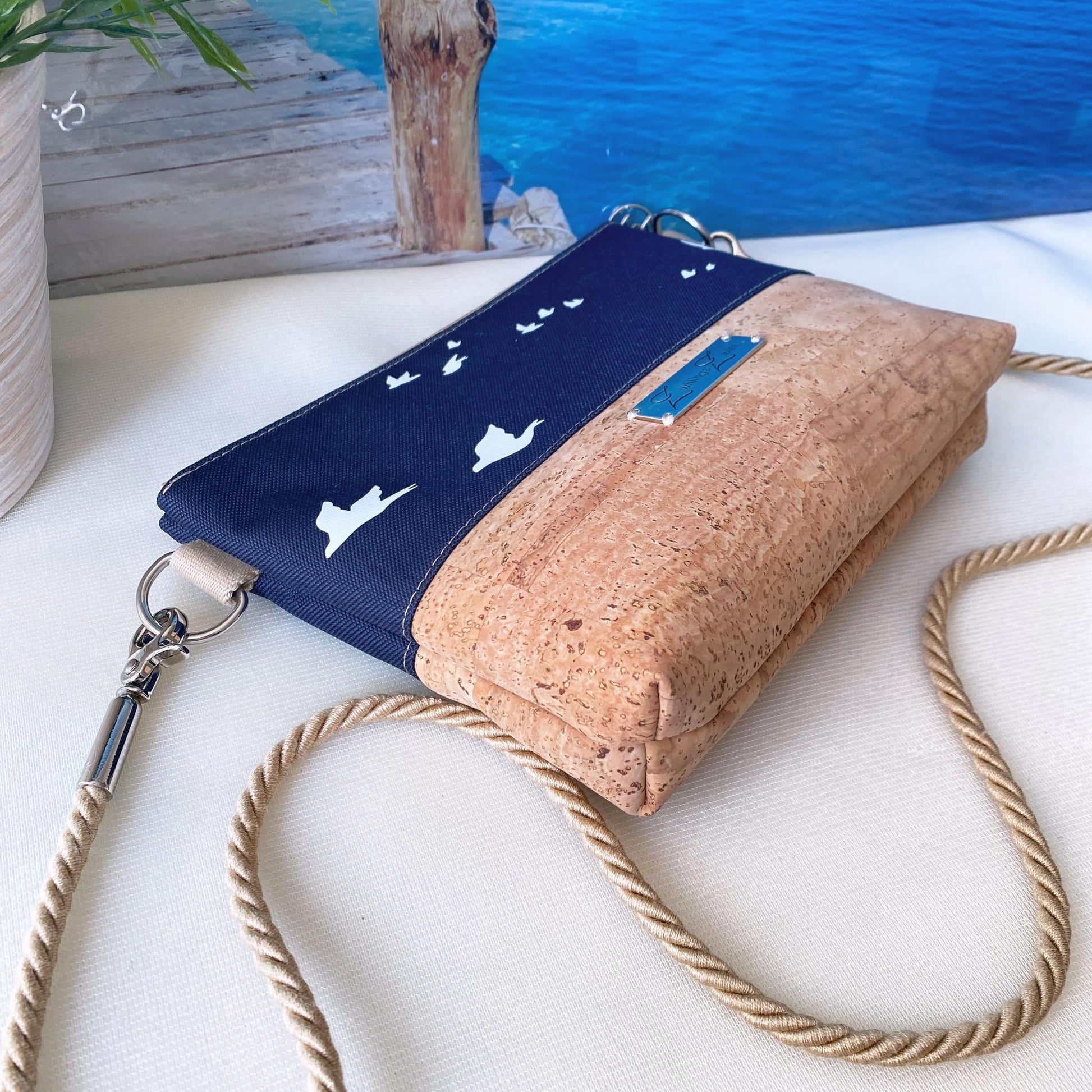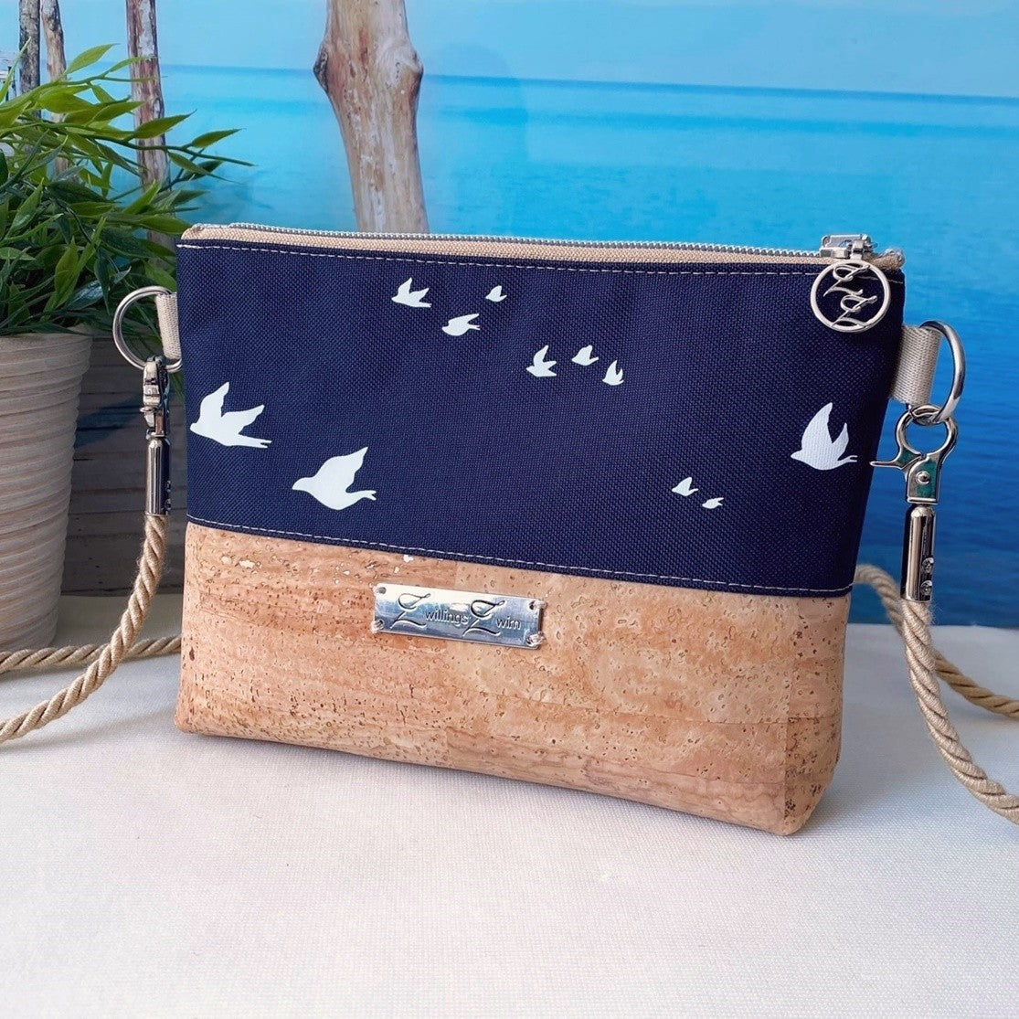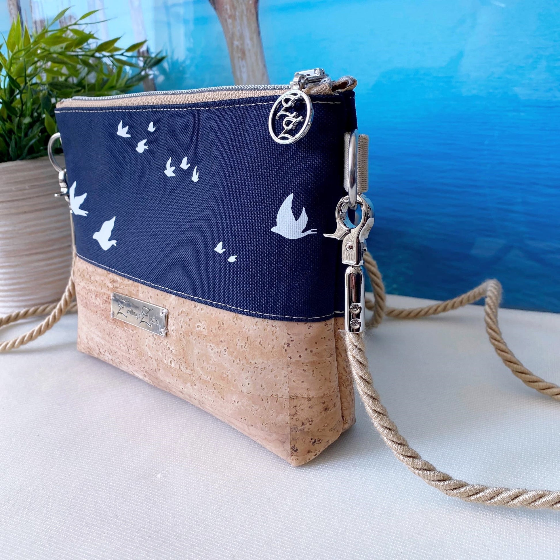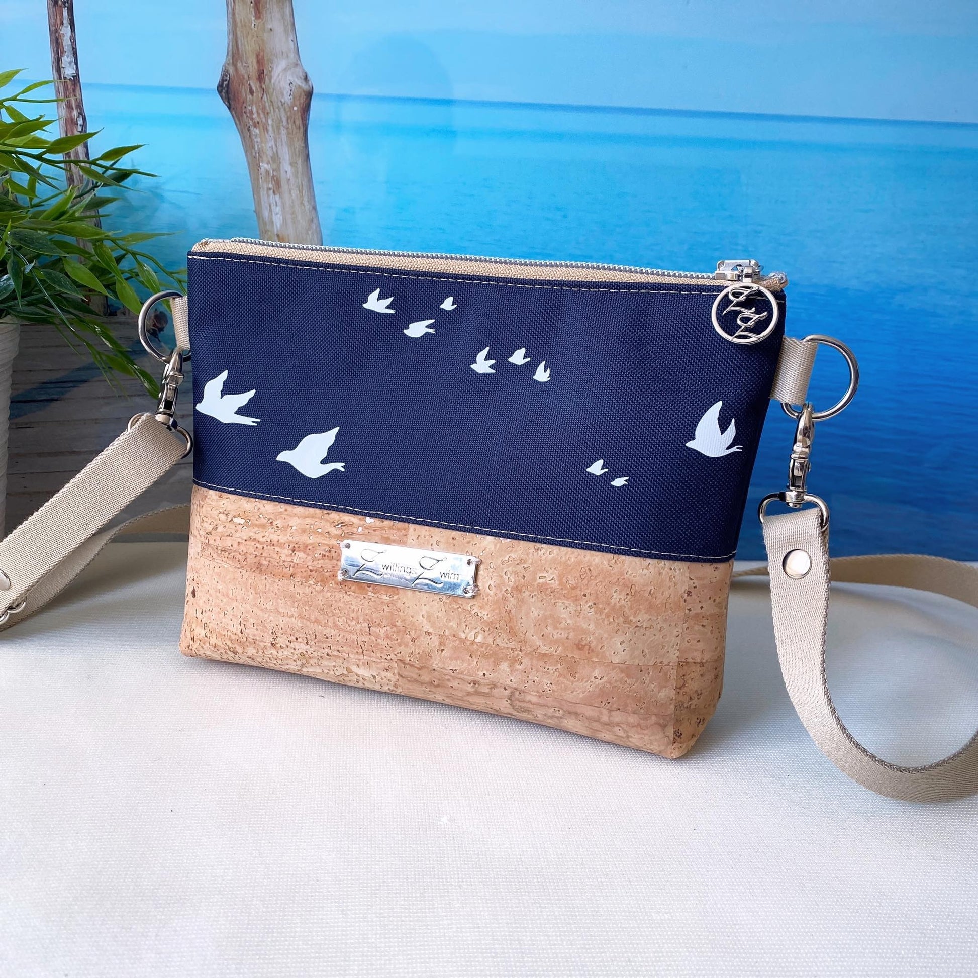 Kleine Umhängetasche *Vögel* Weiß/Nachtblau/Kork Hellbraun