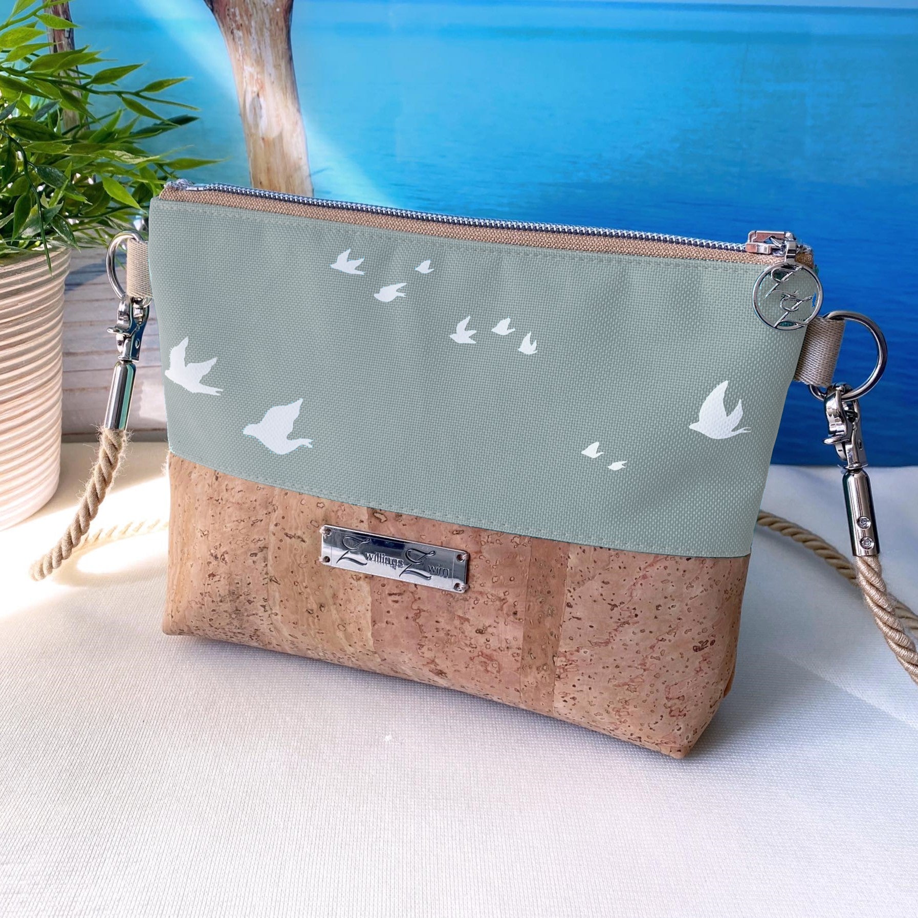 Kleine Umhängetasche *Vögel* Weiß/Altmint/Kork Hellbraun