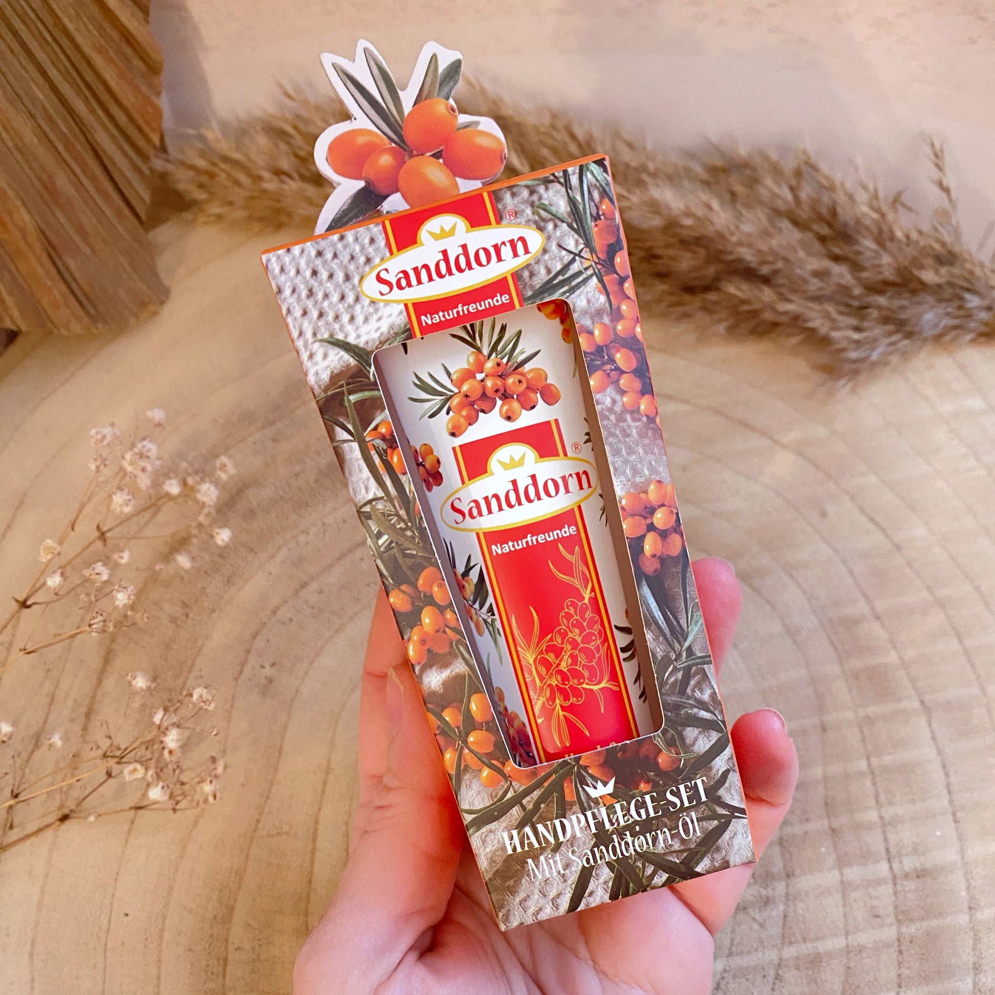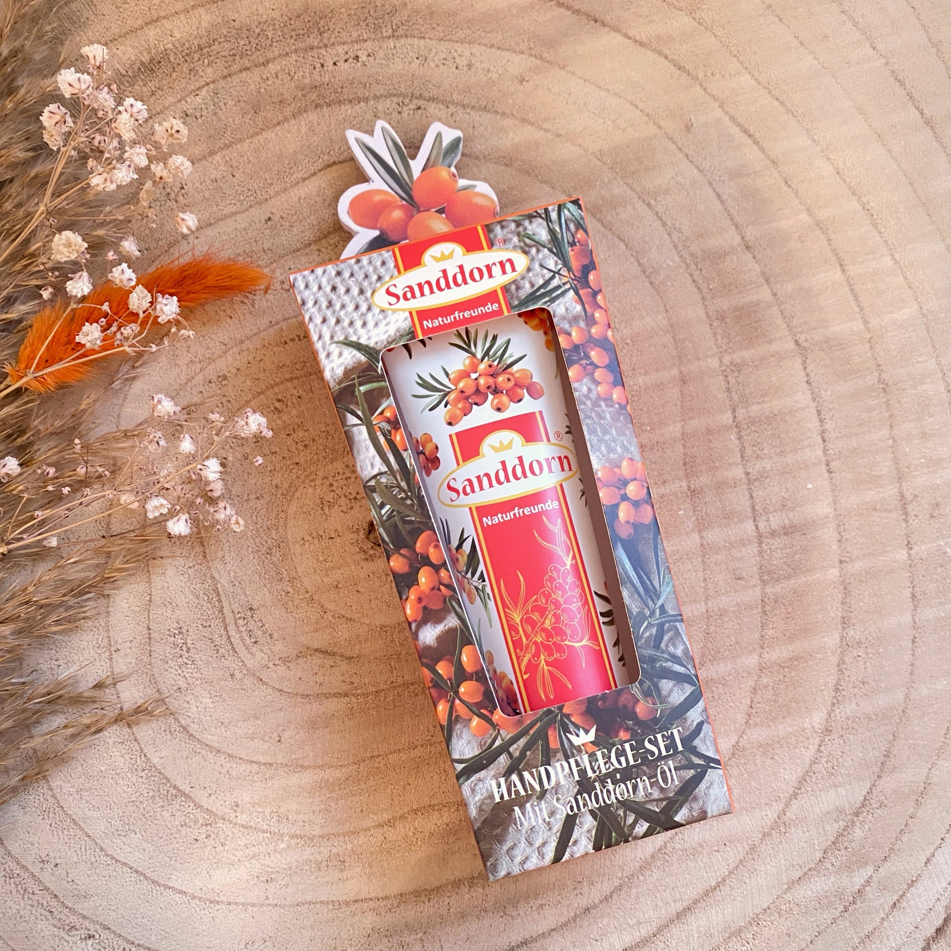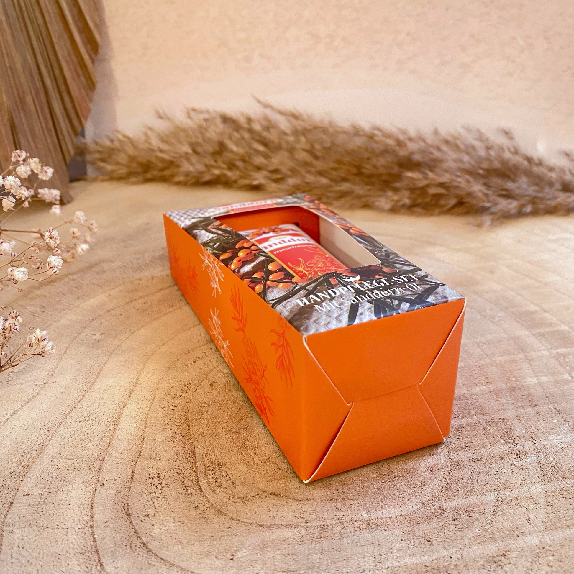Sanddorn Handpflegeset mit Sanddorn Öl in einer Geschenkbox. Die Hand- & Nagelcreme kommt zusätzlich mit einer Nagelfeile als Sanddorn Zweig. Die wertvolle Handcreme spendet durch das Sanddorn Öl zusätzlich Feuchtigkeit und pflegt die Nägel.