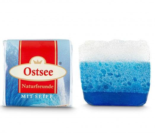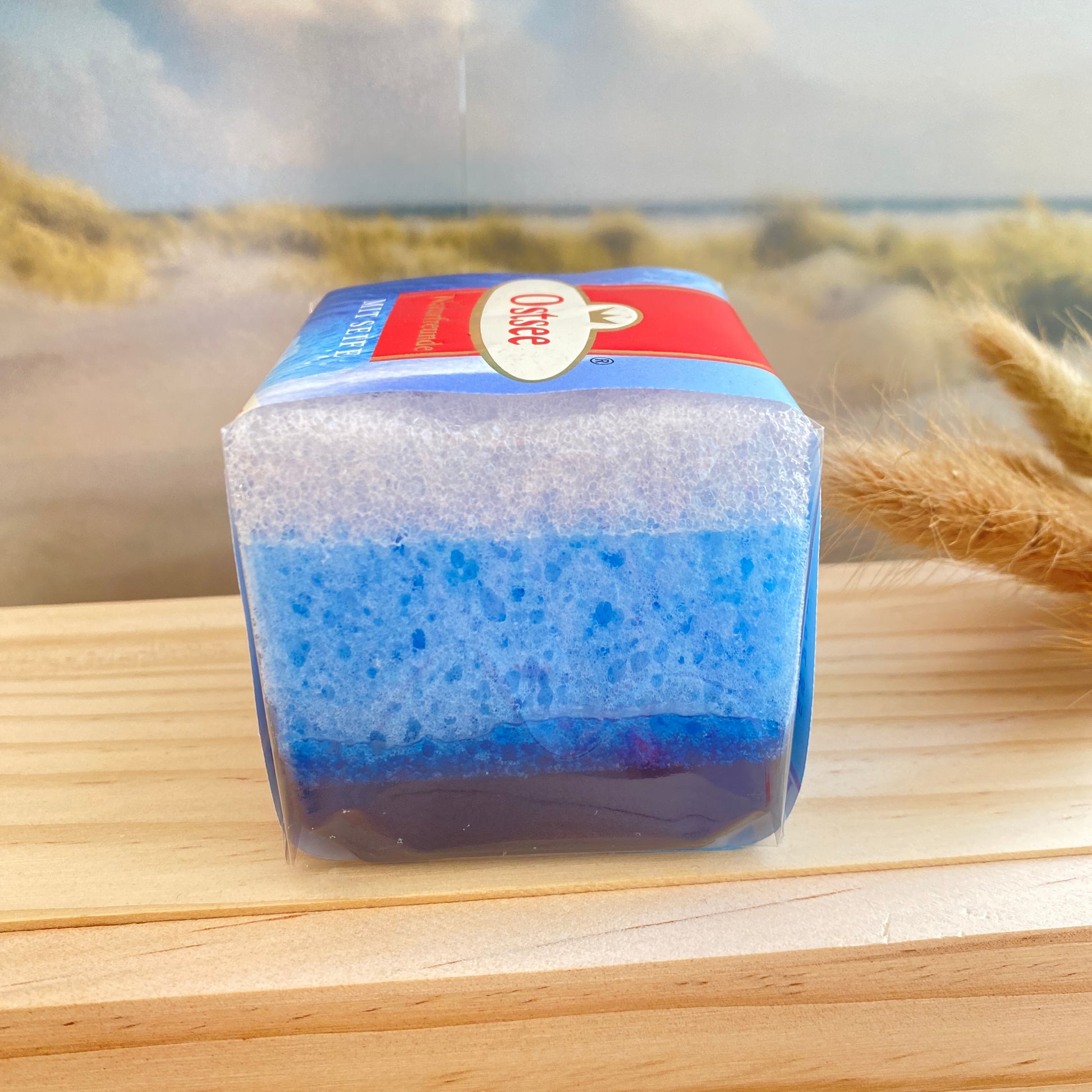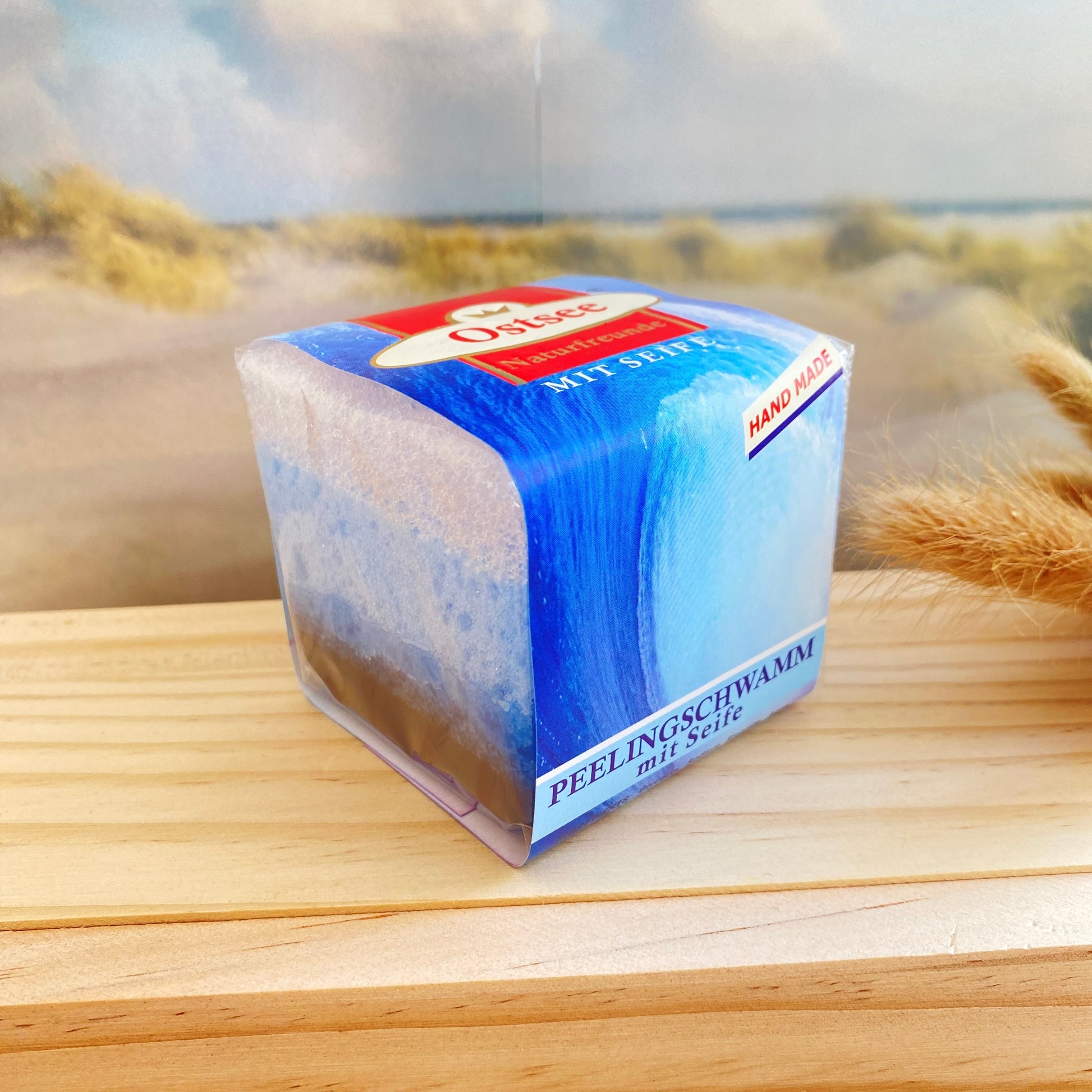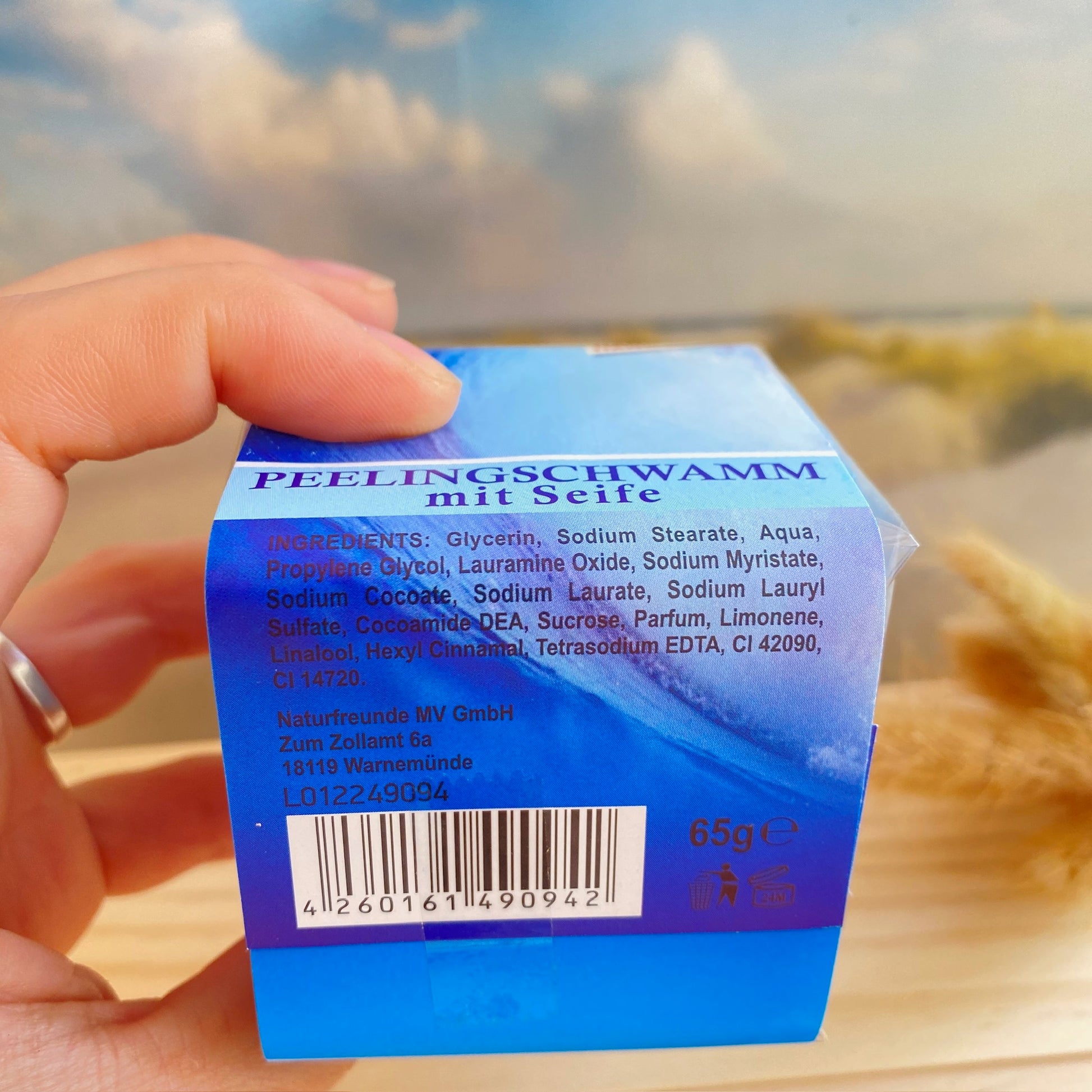 Seife zunächst in den Händen mit etwas Wasser aufschäumen. Danach den Seifenschaum auf die nasse Haut verteilen. Anschließend mit der Peelingschwamm Seite, die Haut in kreisenden Bewegungen massieren.