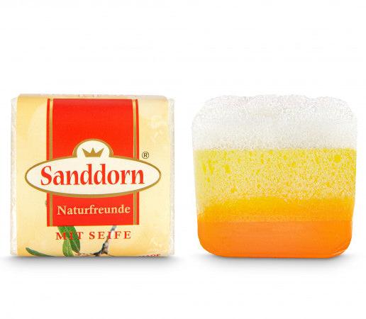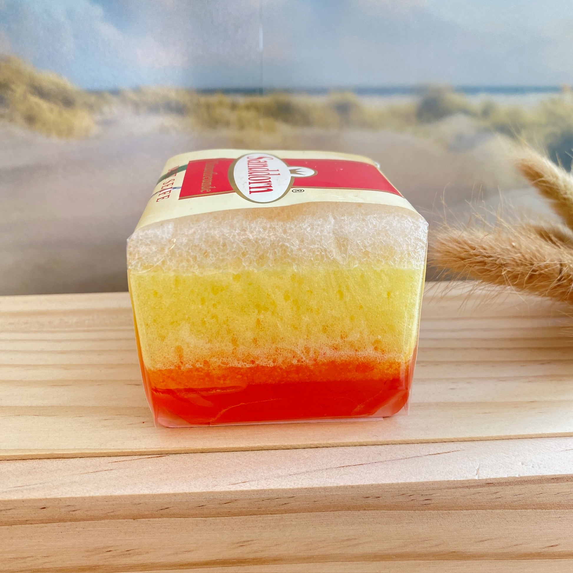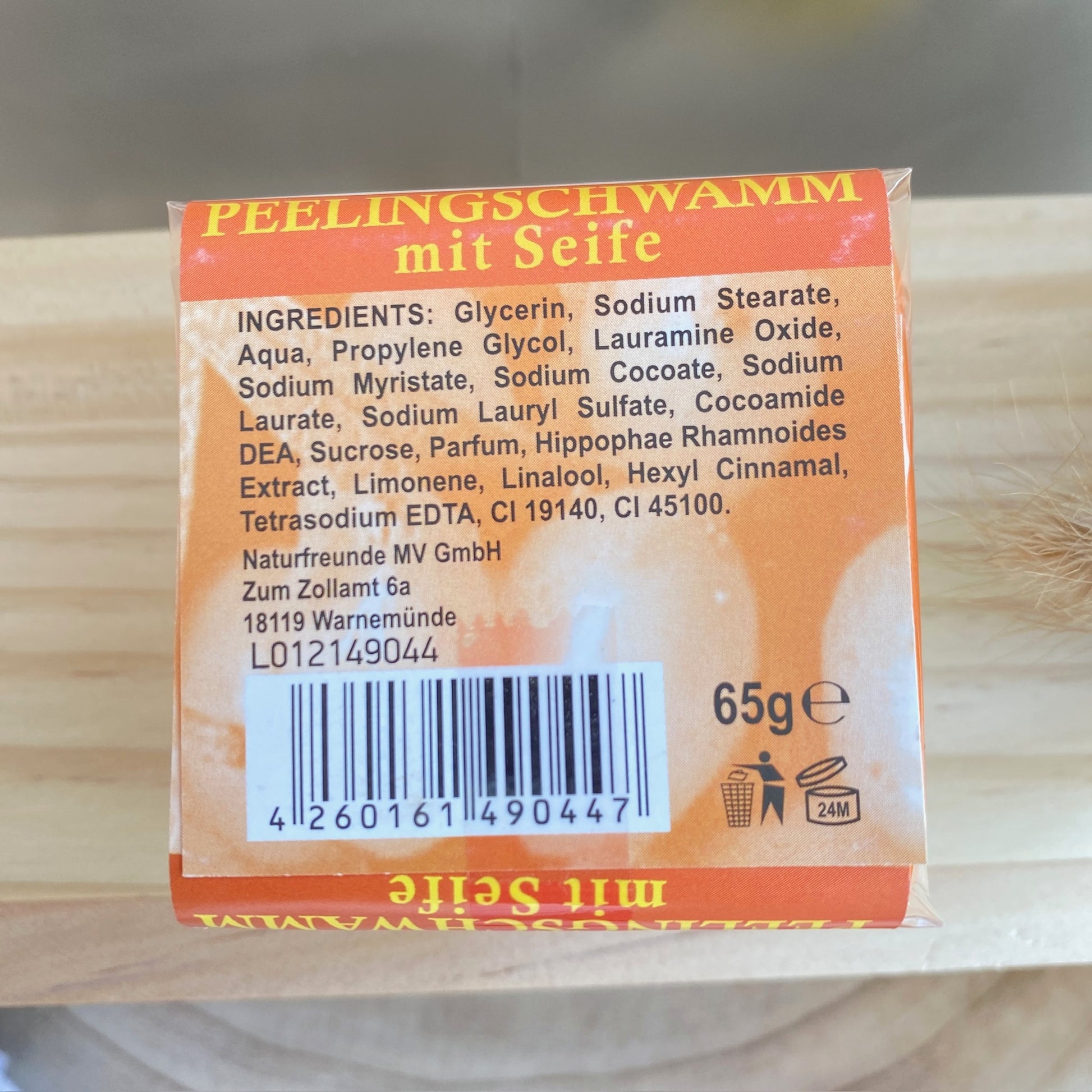 Seife zunächst in den Händen mit etwas Wasser aufschäumen. Danach den Seifenschaum auf die nasse Haut verteilen. Anschließend mit der Peelingschwamm Seite, die Haut in kreisenden Bewegungen massieren.