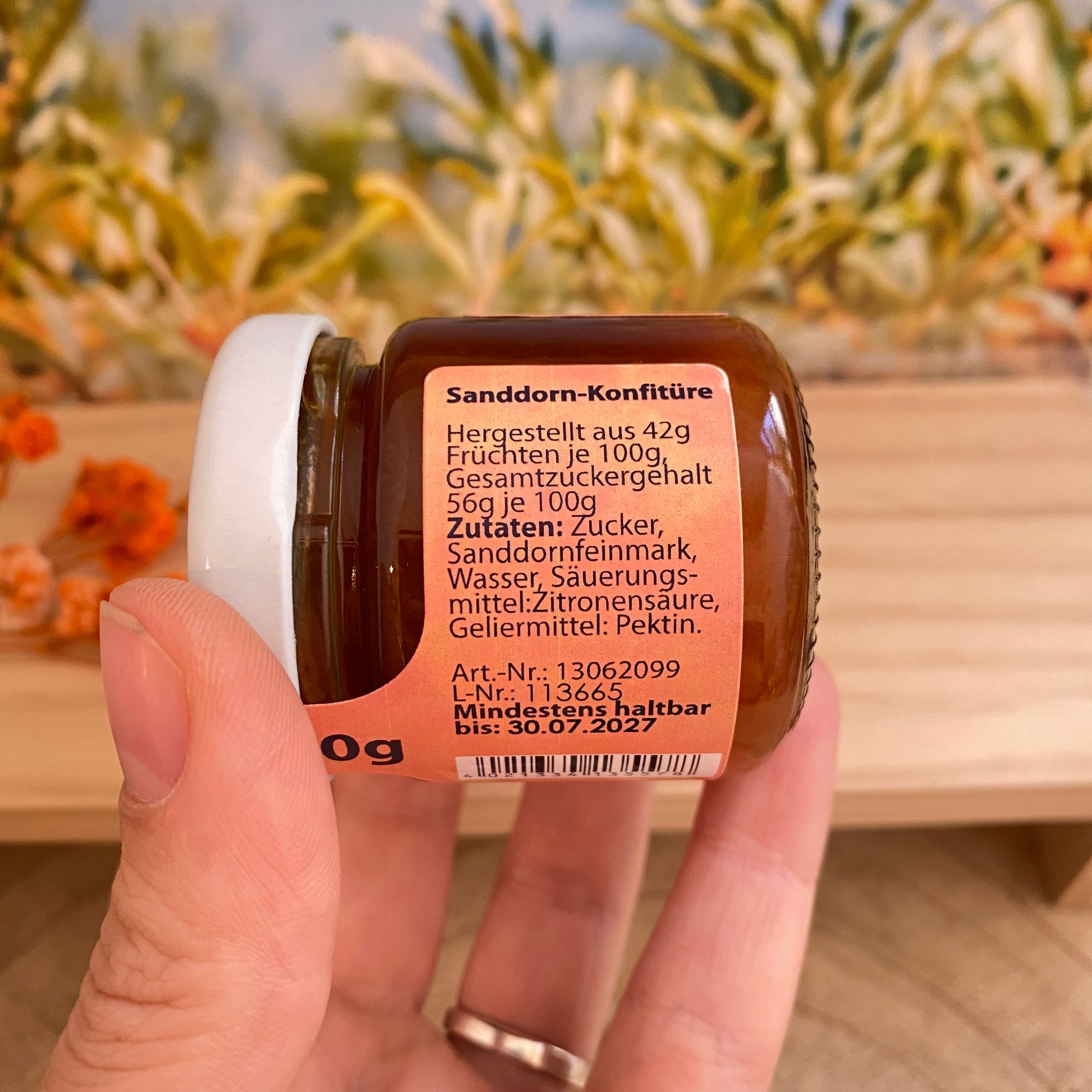 Zutaten: Zucker, Sanddornfeinmark, Wasser, Säuerungsmittel: Zitronensäure, Geliermittel: Pektin.